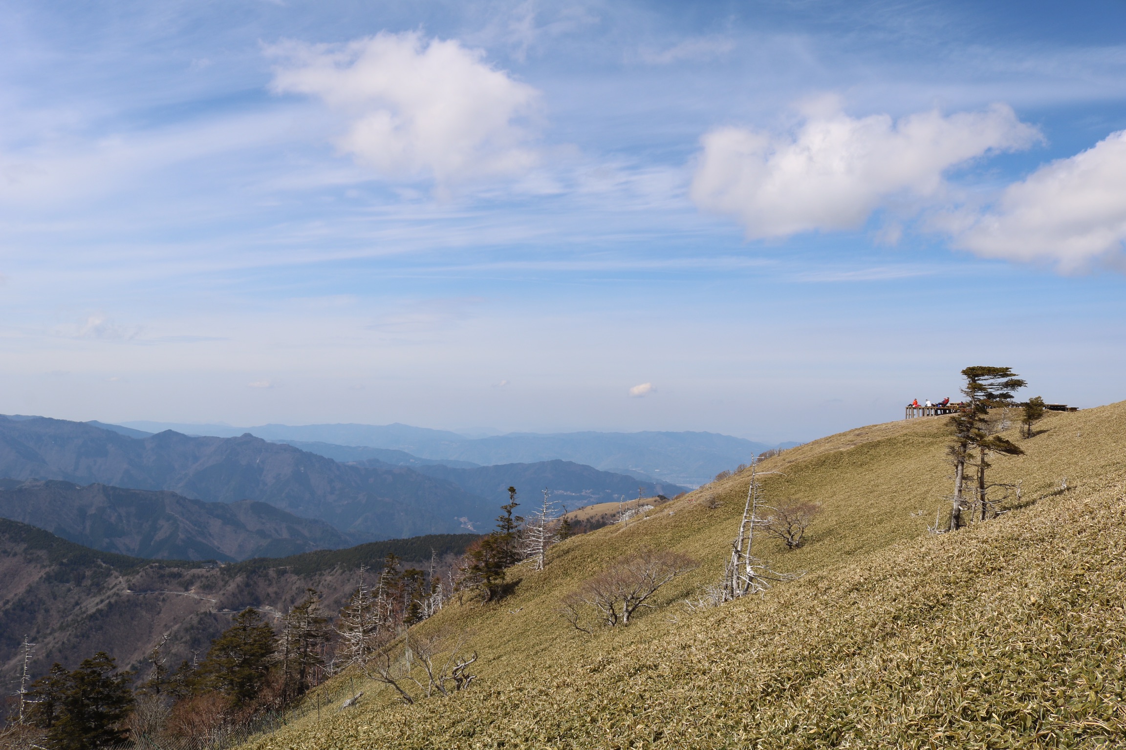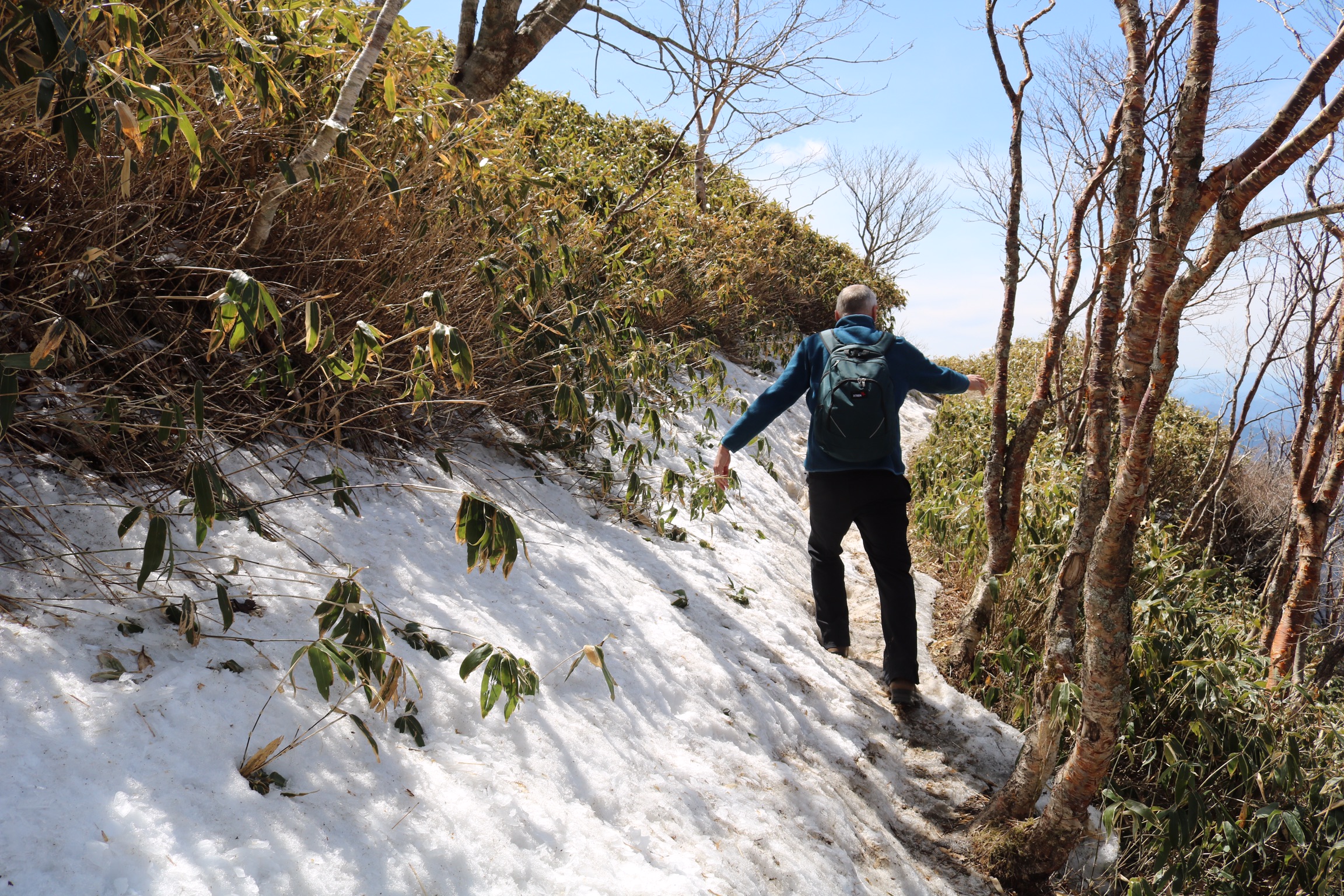 On up the road, to the cable car, which was shut. Indeed the little village at the Tsurugi shrine was pretty deserted too as it was too early in the season, but we did manage a cup of coffee, sadly nothing to eat was on offer, so our three hour hike was done on water and two Japanese kitkats and rumbling stomachs. There are several routes up. We chose the meandering one but hadn’t factored in that some of the path would still be snow covered higher up, so parts of the ascent up the 1954 metres were a bit tricky, but the view at the top was worth it.