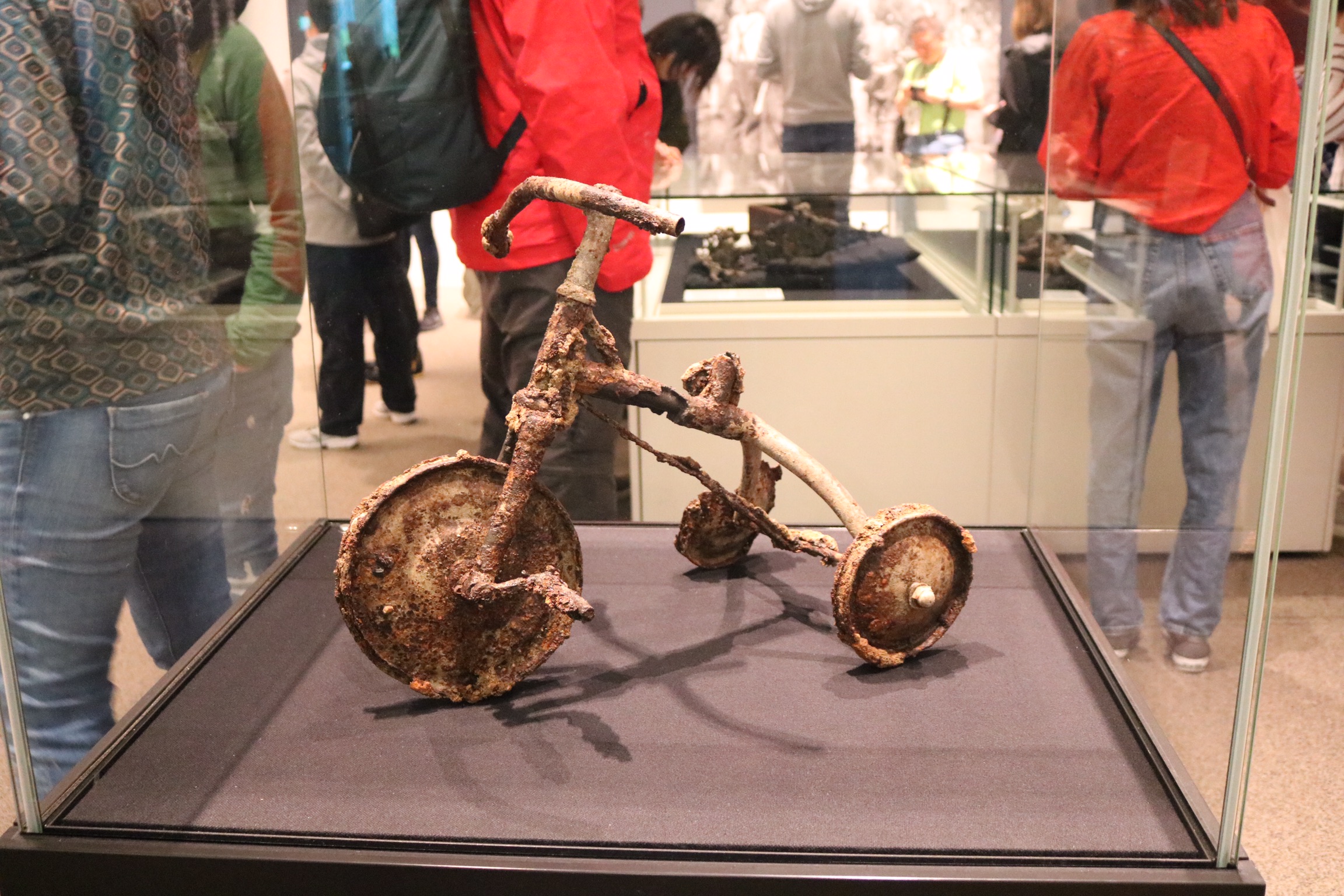 We had thought we might have been able to take a boat trip to see the famous Miajima beauty spot an hour outside Hiroshima, but the weather had turned grey and showery, so we explored the Peace Park. Mankind is sadly stilling killing thousands of people round the world in wars, climate destruction, acts of terrorism, but this is a specific memorial to a moment of manic intense destruction of human life and the park tries to tell us all to make sure it never happens again. The mound mass grave in particular sent shivers up my spine and the circular underground memorial showing all the districts with photos taken a few days after the bombs was very moving, as was the little tricycle which belonged to a little boy killed by the bomb. Shinichi Tetsutani (then 3 years and 11 months) loved to ride this tricycle. That morning, he was riding in front of his house when, in a sudden flash, he and his tricycle were badly burned. He died that night. His father felt he was too young to be buried in a lonely grave away from home, and thinking he could still play with the tricycle, he buried Shinichi with the tricycle in the backyard. In the summer of 1985, forty years later, his father dug up Shinichi’s remains and transferred them to the family grave. This tricycle, Shinichi’s best friend, was donated to the Peace Memorial Museum.