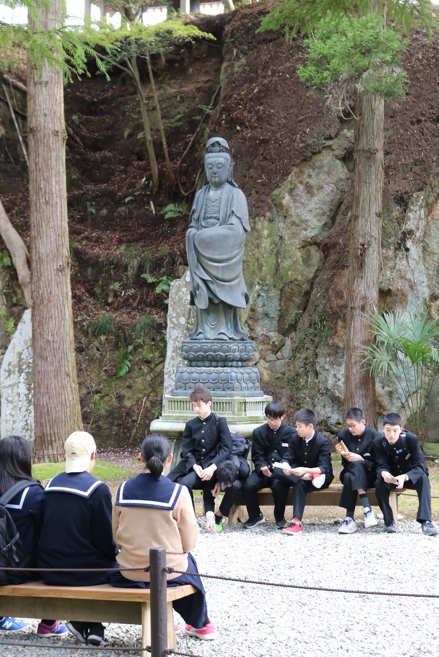 The highlight of the day was our visit to the Zuigan-Ji temple. It is set well back from the main road, in fact other visitors showed us the point on the long drive which was as far as the tsunami reached, thus sparing the temple from major damage. On the right handside are more burial caves hollowed into the rocks. The temple has been rebuilt many times before it was restored to today’s splendour. It is a long plain building from the outside, but inside are magnificent golden panels and gilded screens depicting peacocks, flowers, pines and hawks. Sadly you are not allowed to photograph these treasures, only the little garden the temple looks on to. They were ordered by Date Masamune, a fearsome warrior who ruled nearby Sendai from 1603 till 1636. He was known as the one eyed dragon as he lost an eye in childhooddue to smallpox. His Date clan ruled the city for 270 years. He employed the best craftsmen and highest quality materials. The restored treasures look magnificent and the museum has some interesting finds and a video showing the recent painstaking renewal of the temple roof. Again we saw schoolchildren roaming the grounds with their teacher trailing behind.