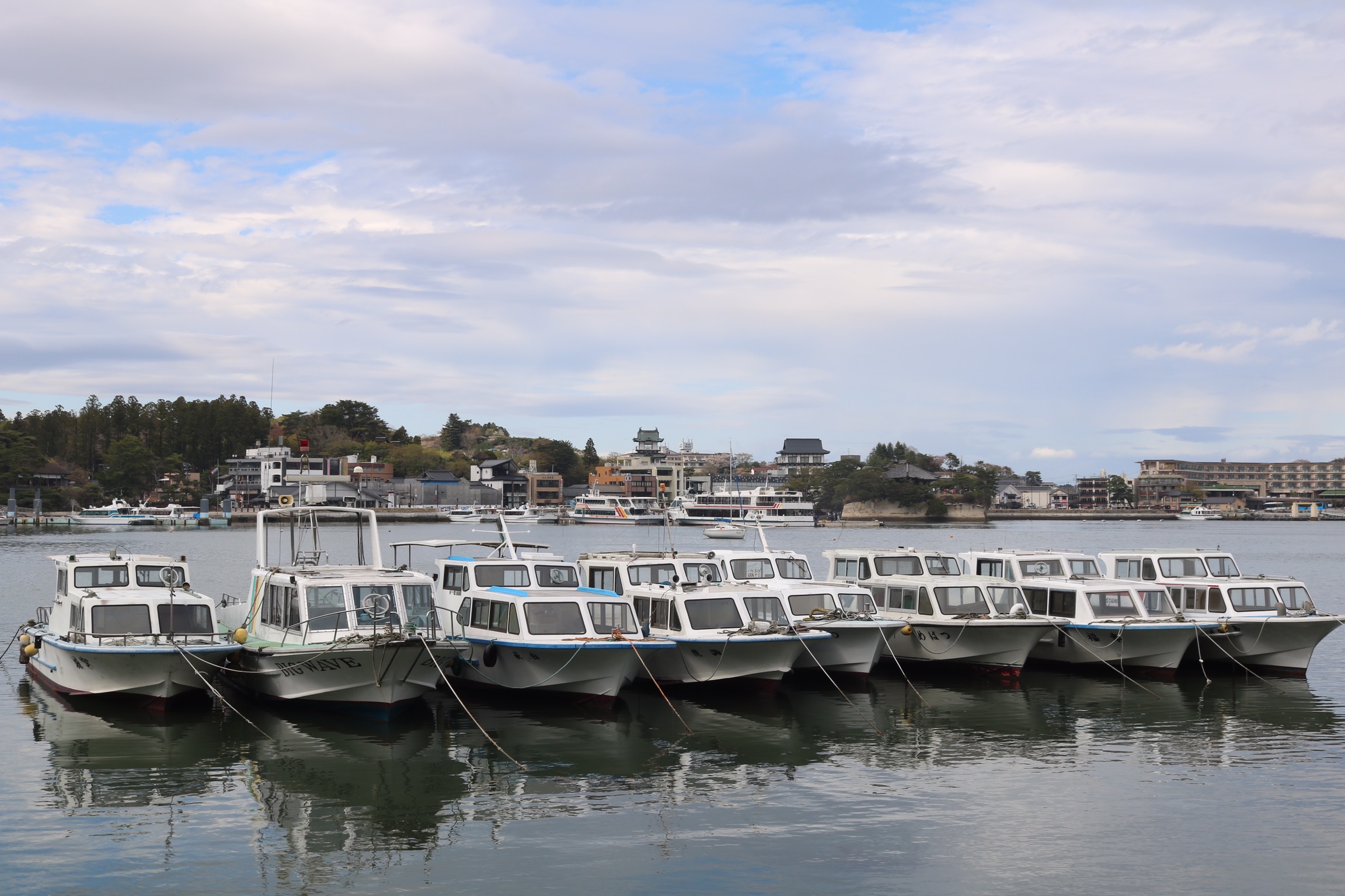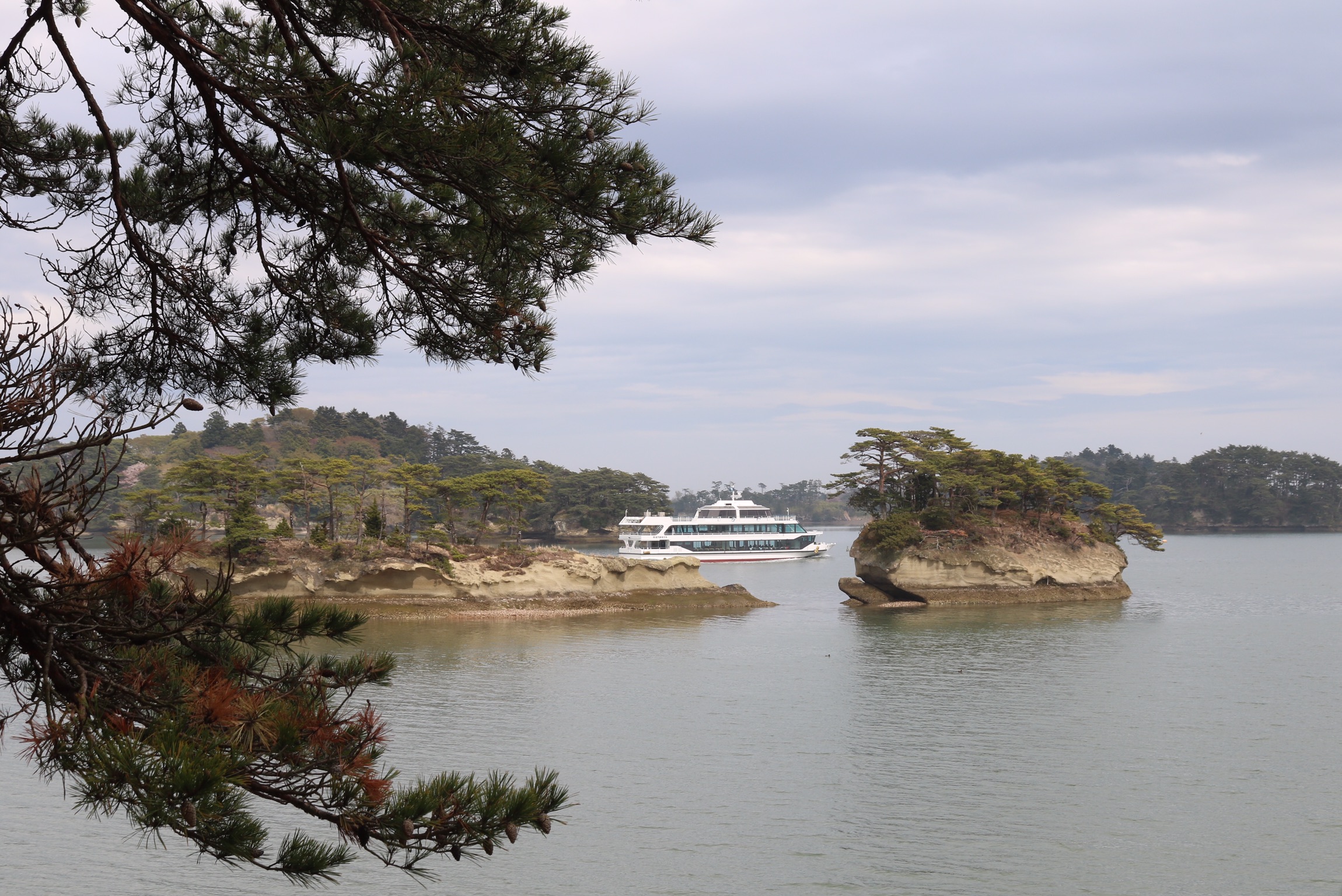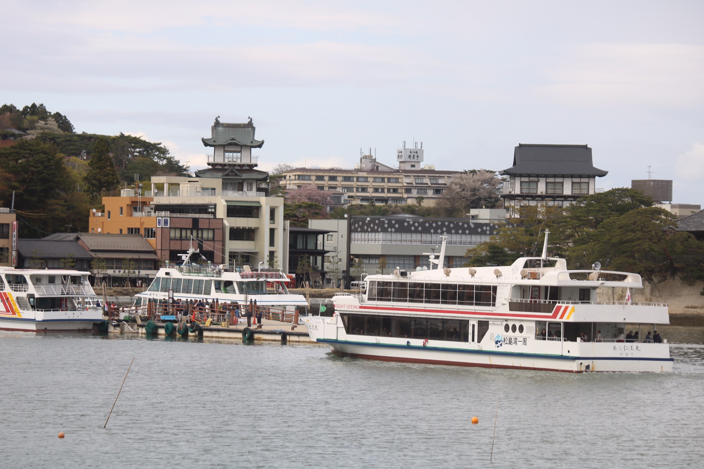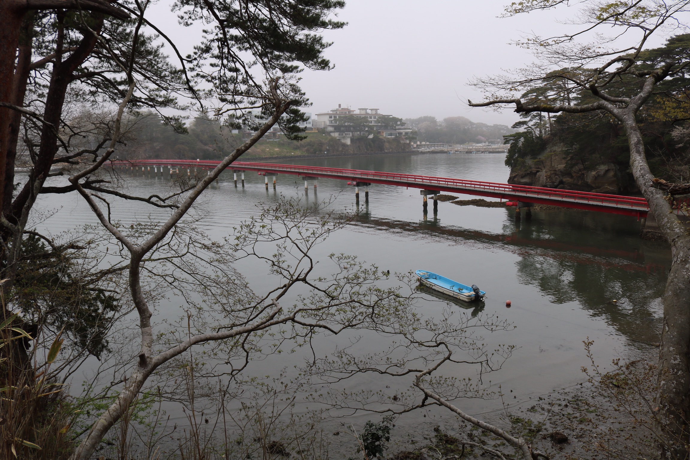 We arrived in Matsushima on a very grey day with poor visibility, which was a shame as it is designated one of Japan’s top three scenic areas, along with Miyajima and Amanohasidate neither of which we had managed to visit. The town itself is very commercialised and has a very busy main road running next to the sea which is not very appealing. Our plan had been to take a boat trip into the bay to see the 260 islands of every conceivable shape and size, some said to resemble tortoises, whales or human profiles. the islands are credited with forming a natural barrier that spared Matsushima from the worst of the effects of the terrible tsunami in 2011. However, there was no point as the visibility was so bad, so we contents ourselves with a walk across the 252 m red footbridge over the oyster beds to walk around the island of Fukui-Jima. We did a bit of litter picking on the beach and had an expensive coffe and were surprised to find a little bit of Holland in the form of a mass of colourful tulips, as the only other colour had been the red camelia flowers.