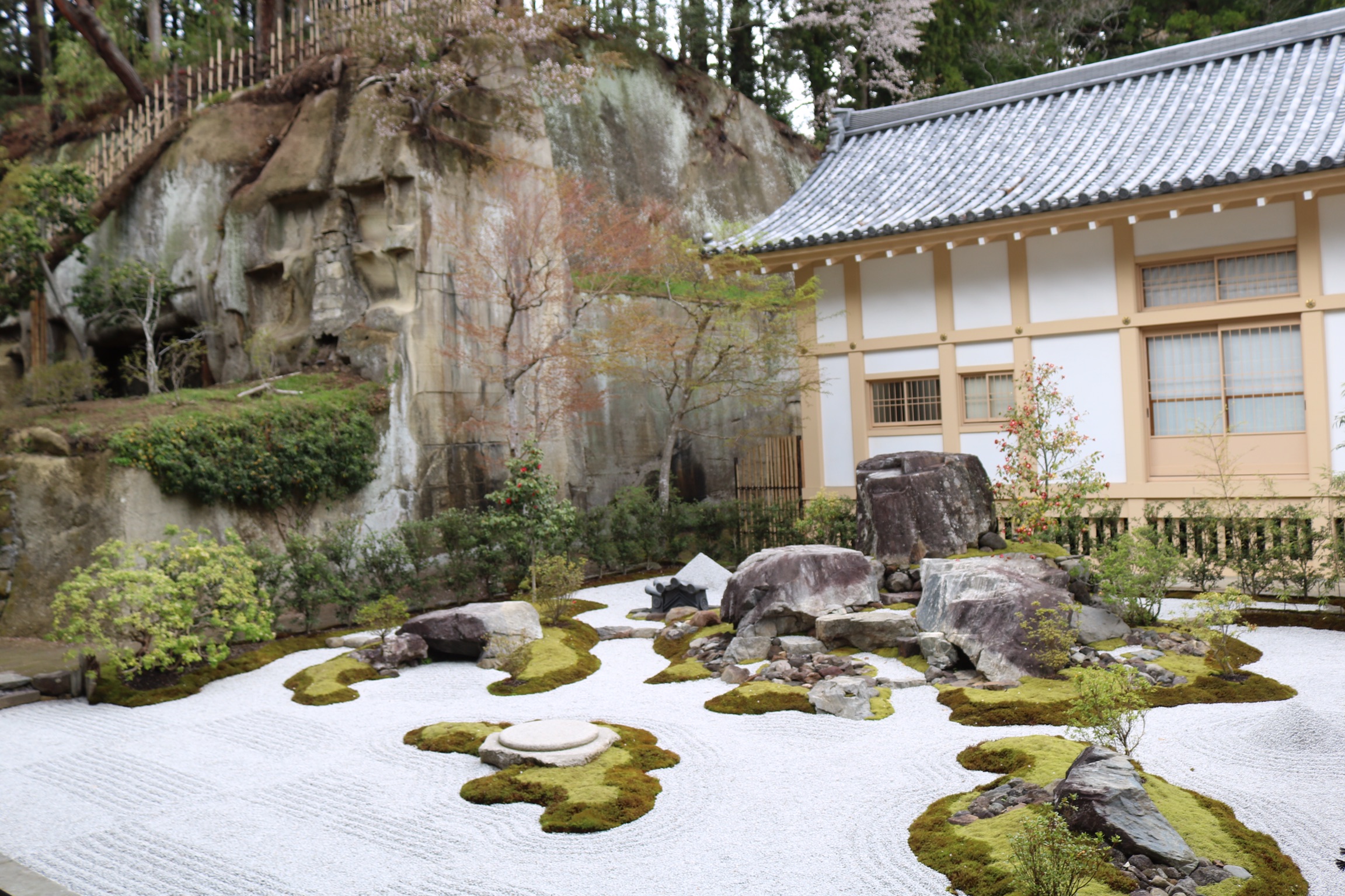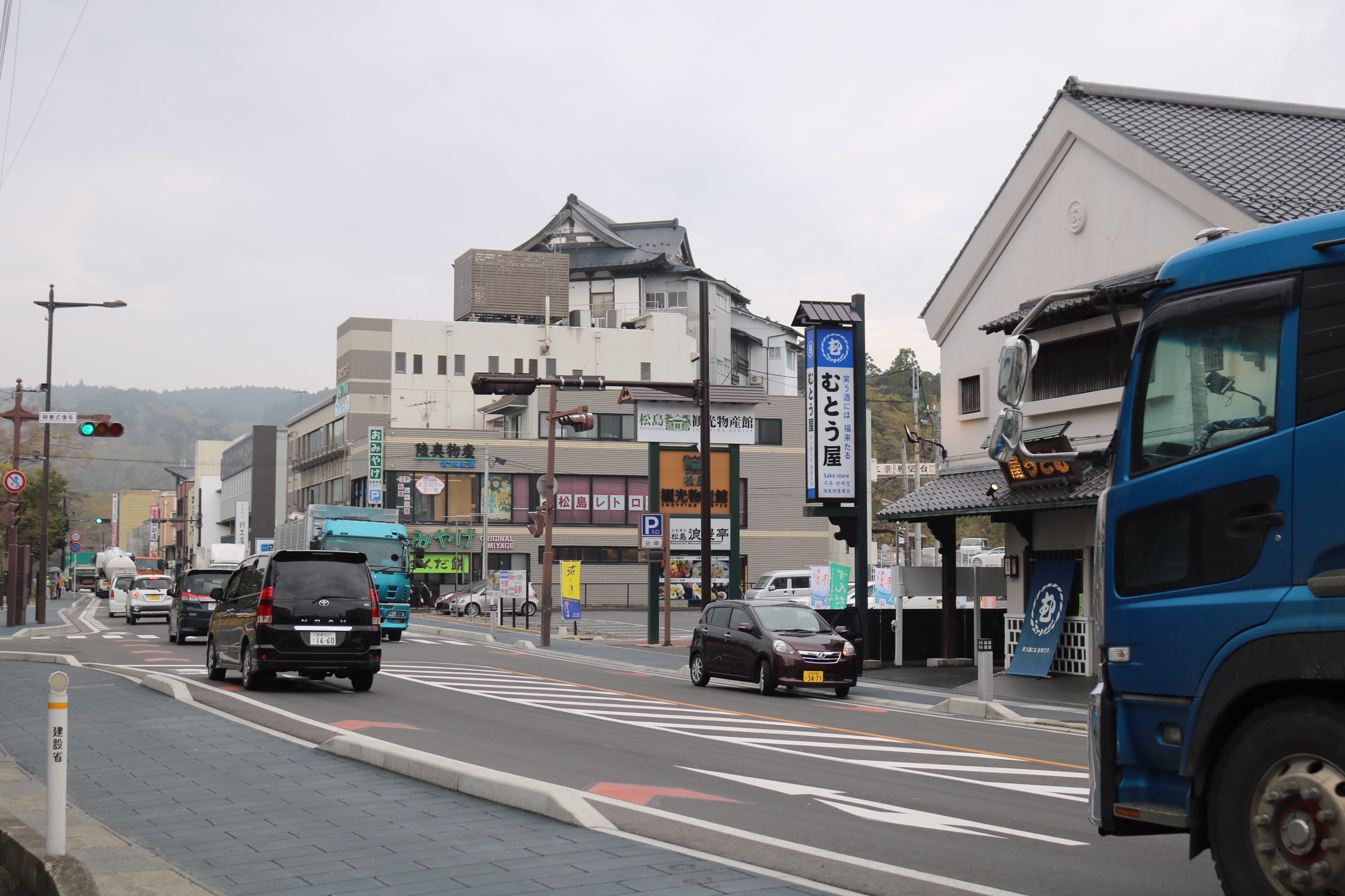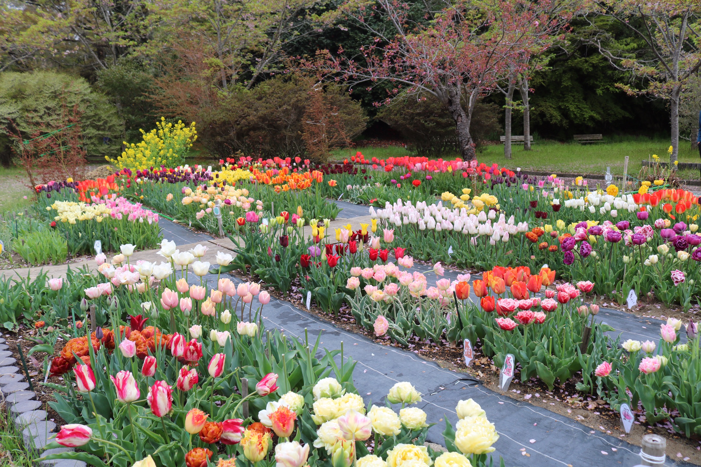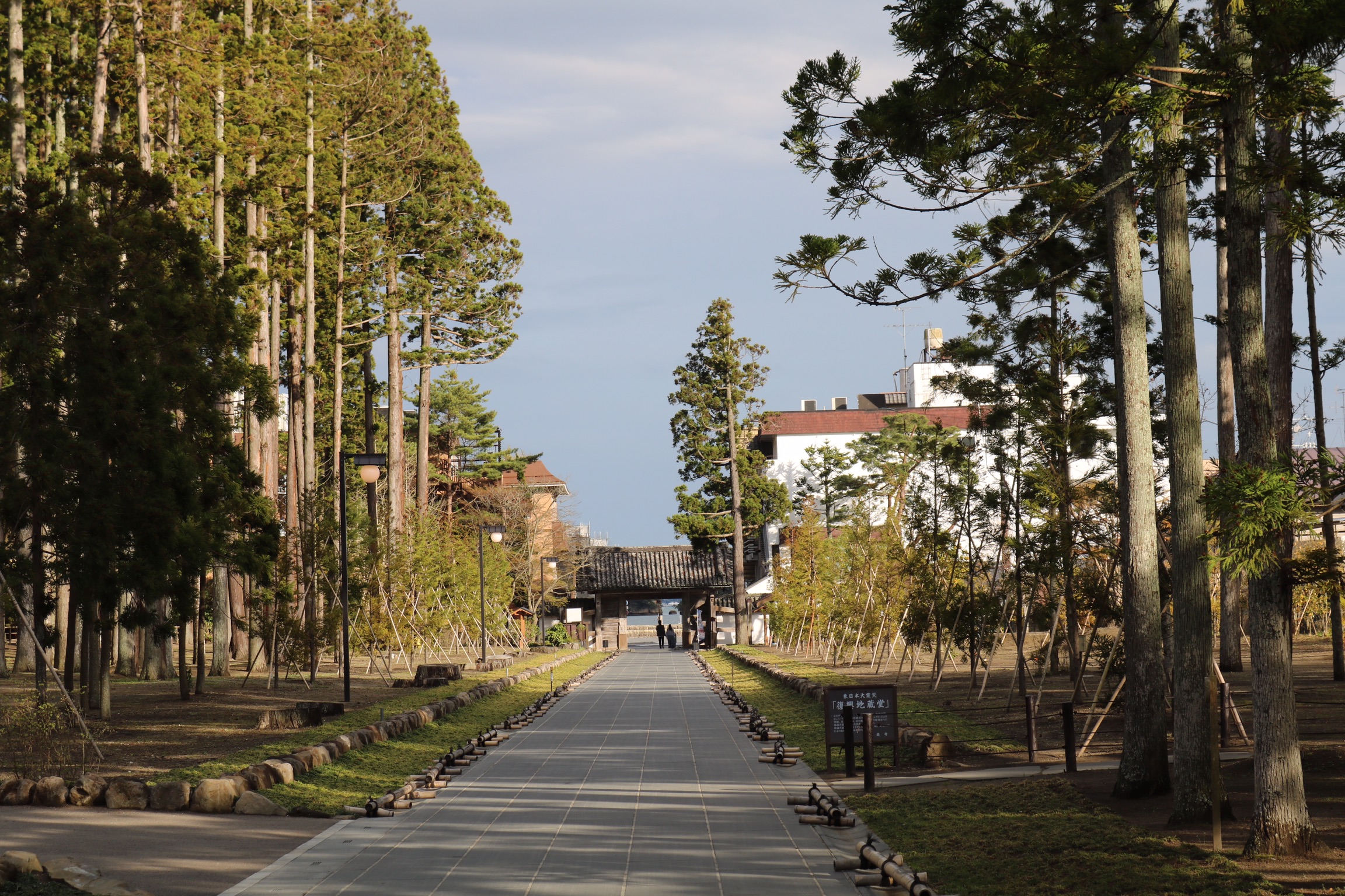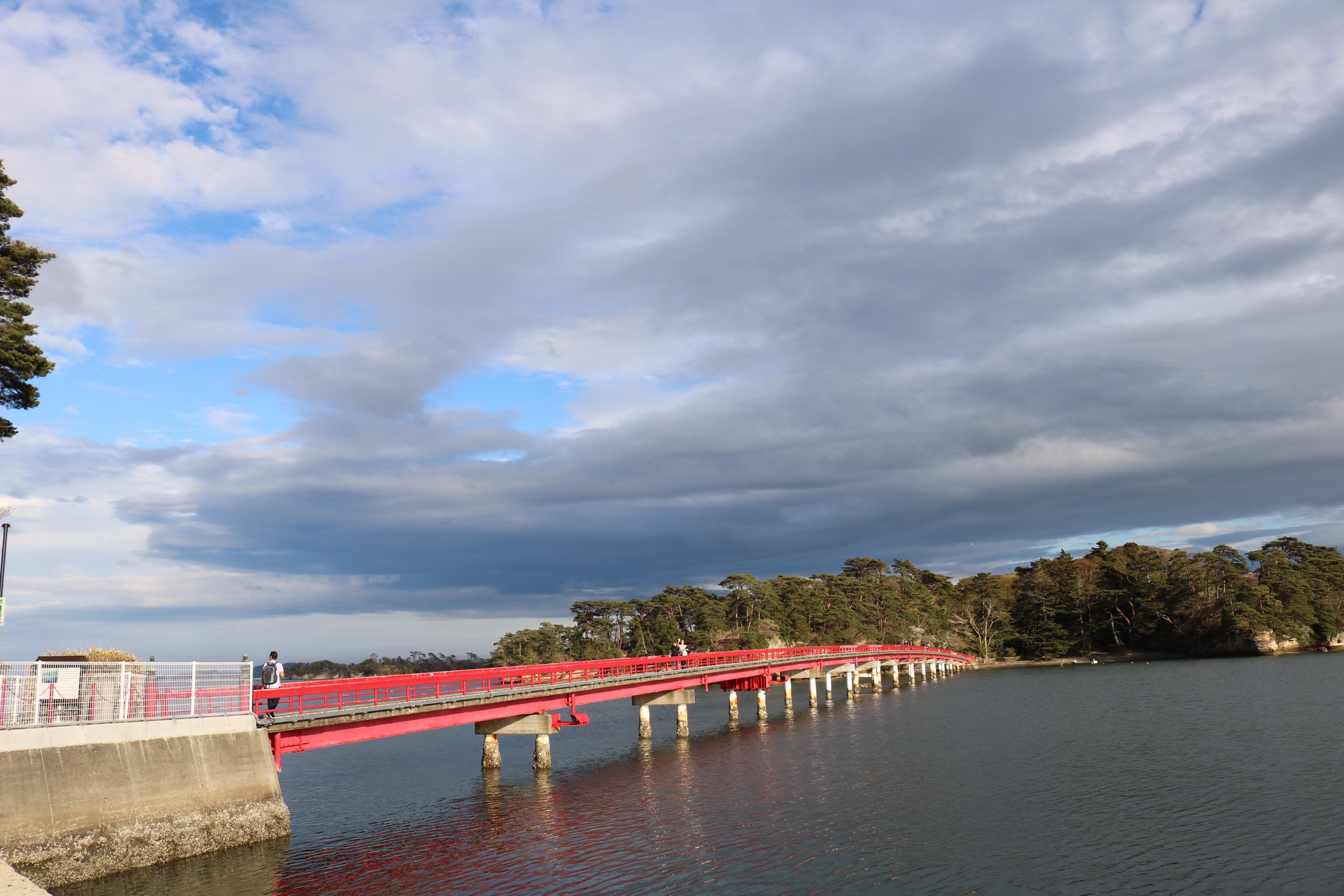 We arrived in Matsushima on a very grey day with poor visibility, which was a shame as it is designated one of Japan’s top three scenic areas, along with Miyajima and Amanohasidate neither of which we had managed to visit. The town itself is very commercialised and has a very busy main road running next to the sea which is not very appealing. Our plan had been to take a boat trip into the bay to see the 260 islands of every conceivable shape and size, some said to resemble tortoises, whales or human profiles. the islands are credited with forming a natural barrier that spared Matsushima from the worst of the effects of the terrible tsunami in 2011. However, there was no point as the visibility was so bad, so we contents ourselves with a walk across the 252 m red footbridge over the oyster beds to walk around the island of Fukui-Jima. We did a bit of litter picking on the beach and had an expensive coffe and were surprised to find a little bit of Holland in the form of a mass of colourful tulips, as the only other colour had been the red camelia flowers.