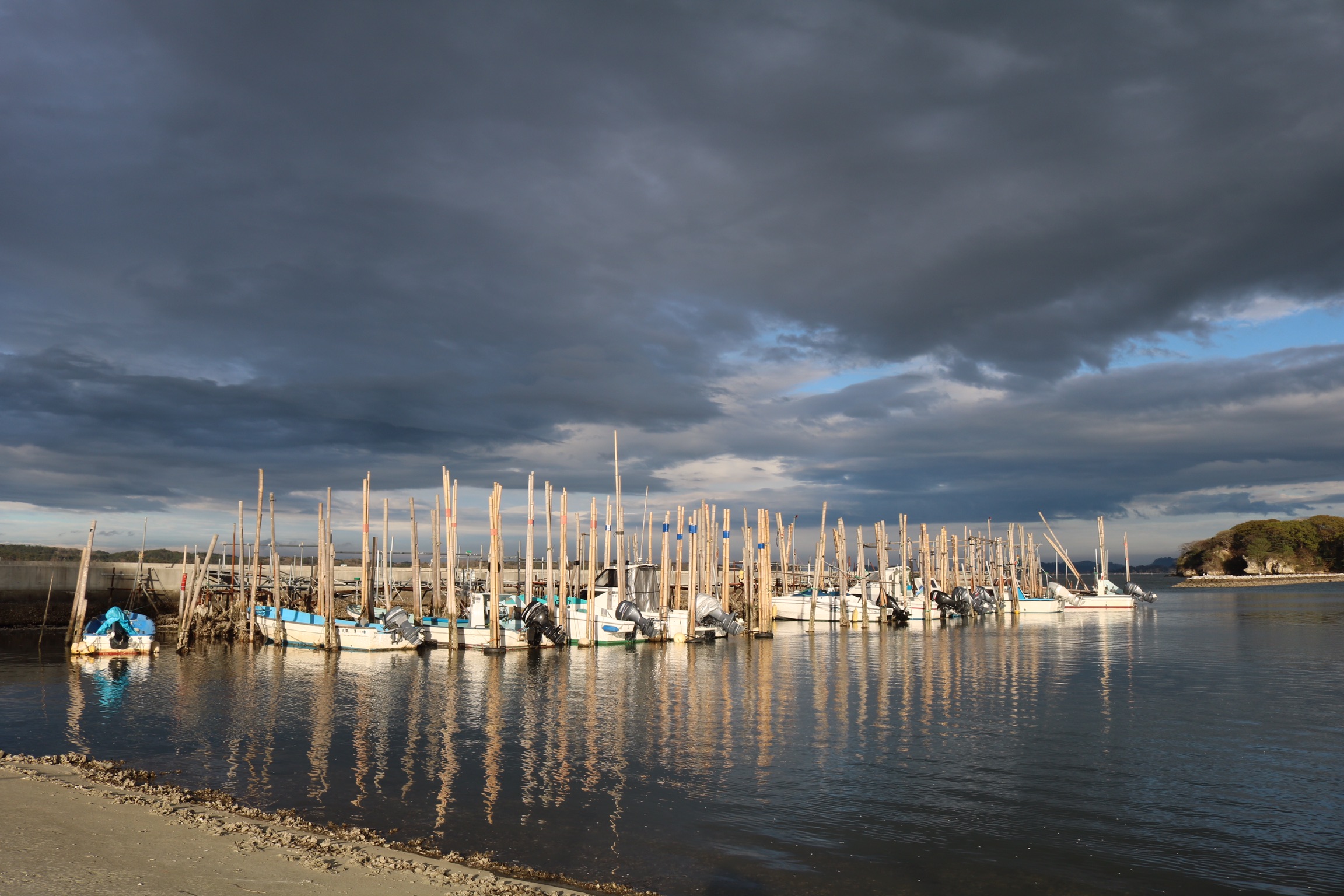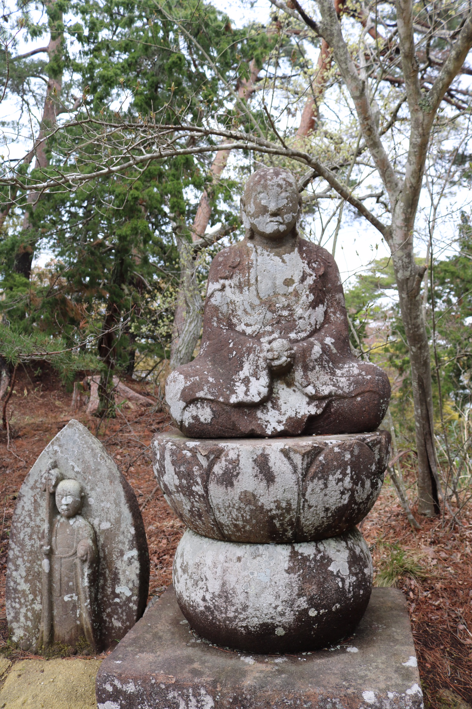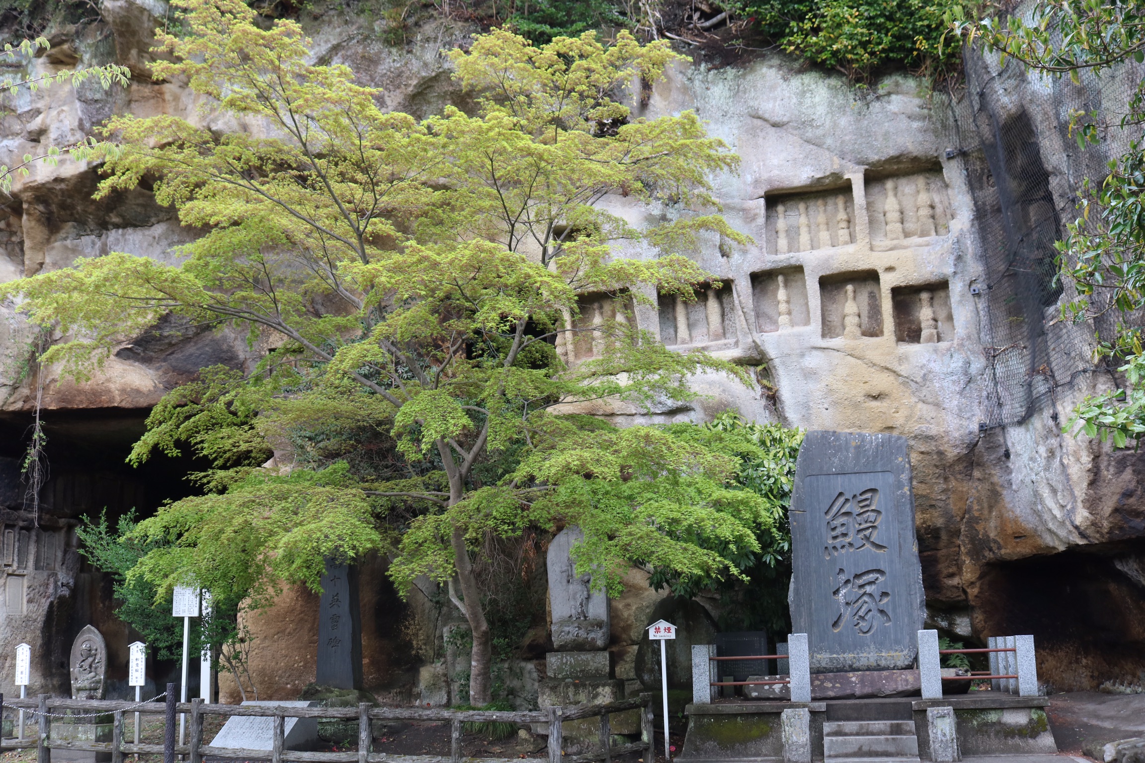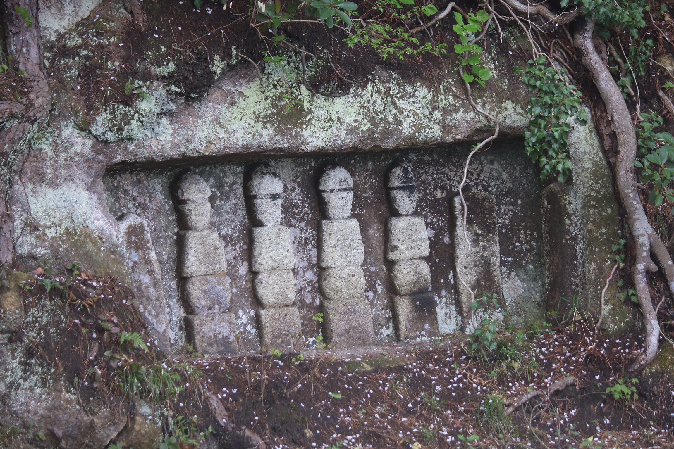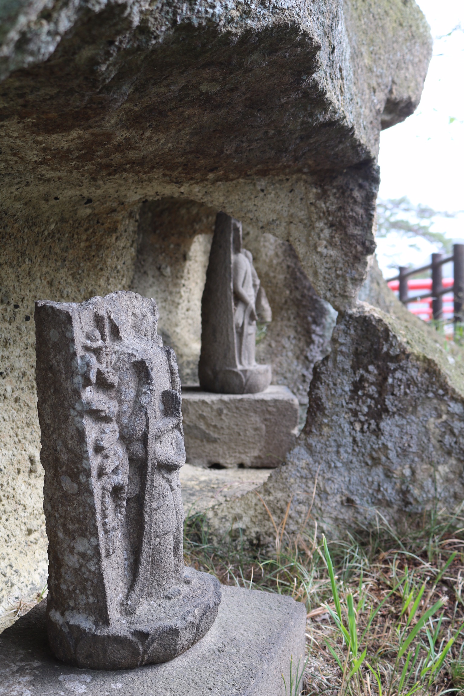 We explored further along the coastline on the new footpath, past reminders of how high the tsunami had reached to Oijima, a tiny island where centuries ago the soft volcanic rock was hollowed into over a hundred little caves which still hold weatherbeaten statues and carved votary tablets. We had the place to ourselves and it felt very peaceful, with lovely views of the boats and some of the nearer islands had started to appear from the mist.