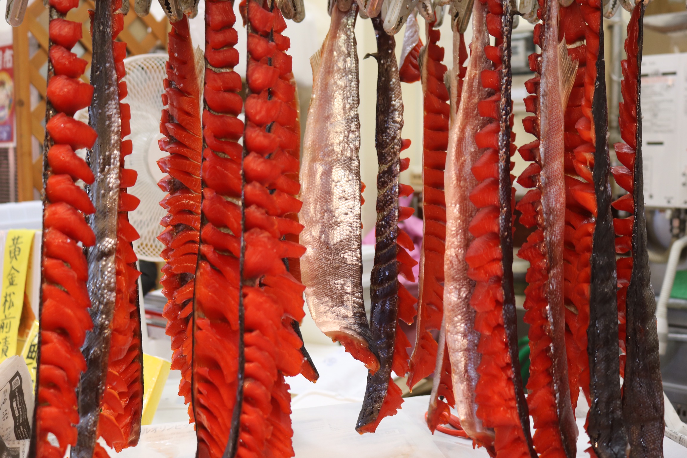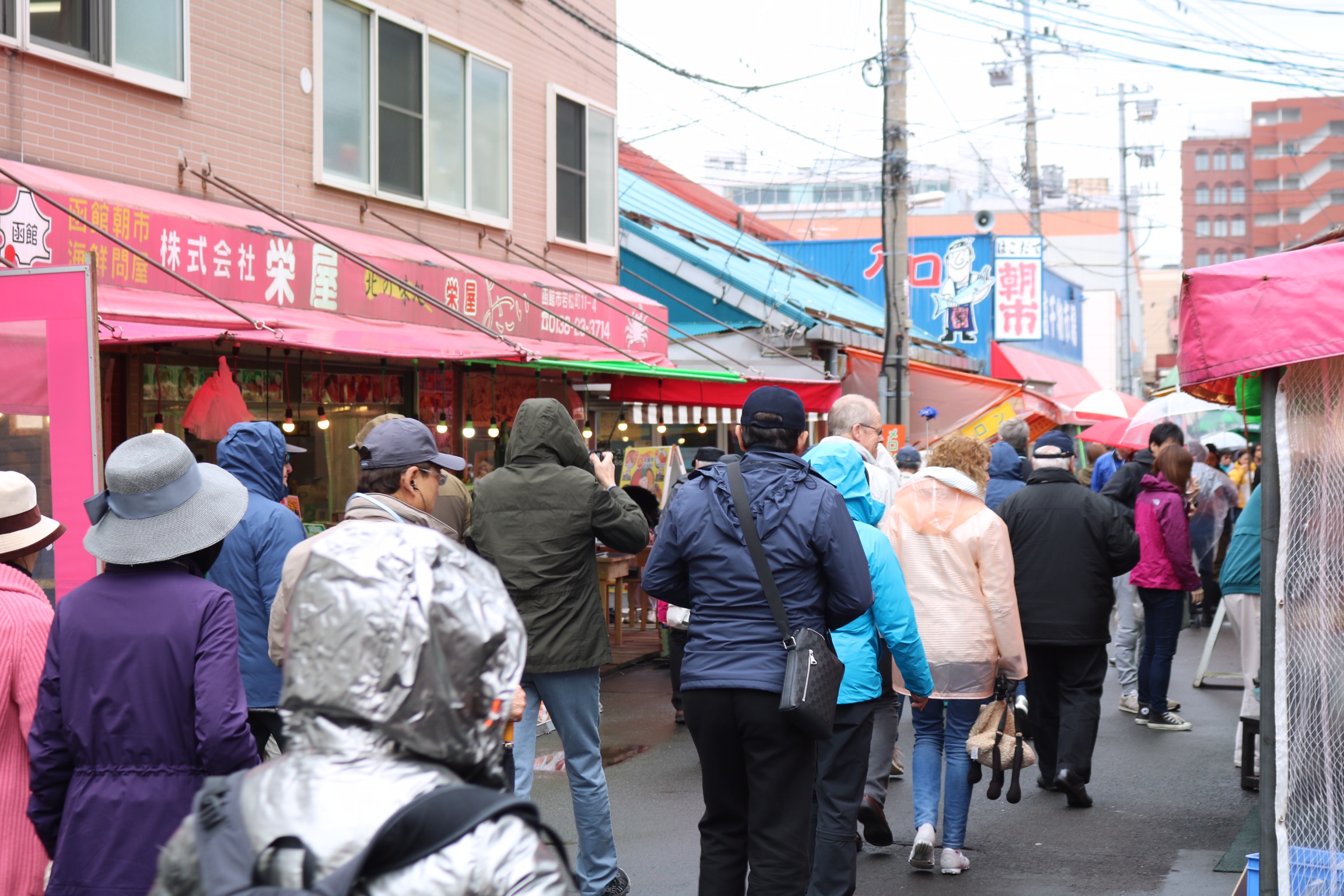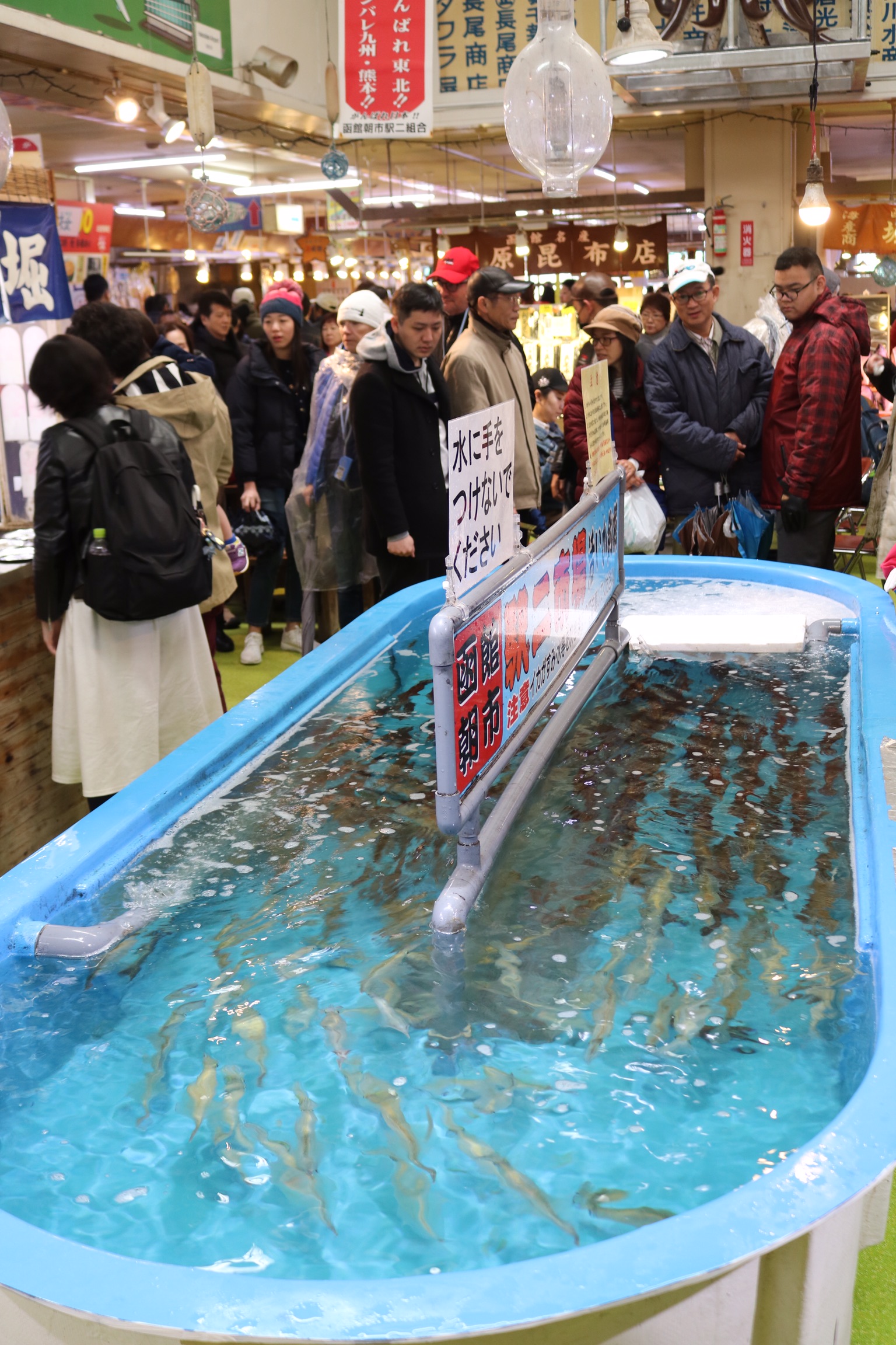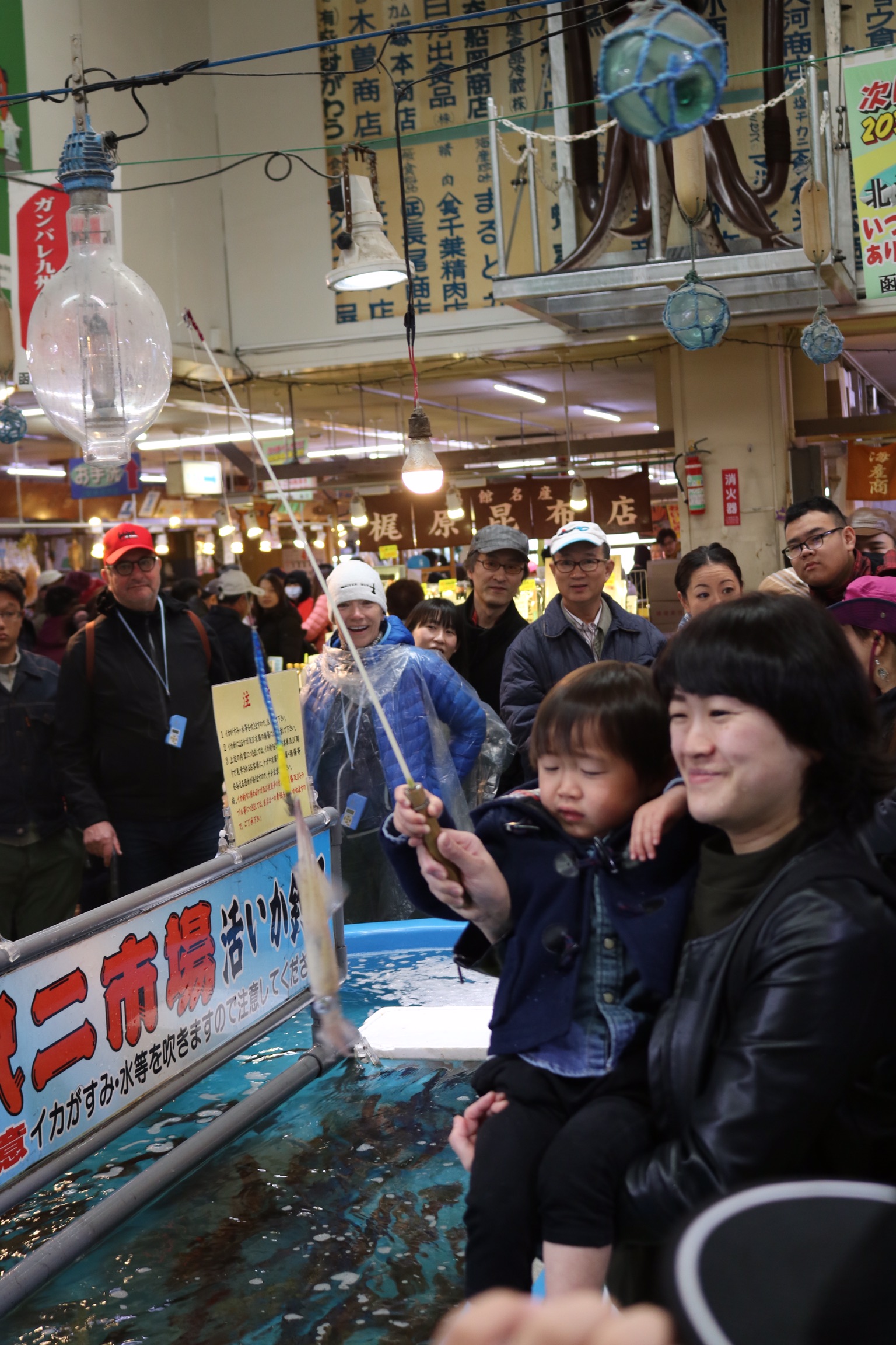 The next day before we left we visited the Asa-ichi fish market. They offer you the chance to catch fresh squid and then eat it as sashimi. I am not sure the little boy who caught one would eat it. A large cruise ship was berthed and its passengers snaking in the drizzle after their tour guides. The stall holders were trying hard to get them to buy the seafood delights in offer, but they were probably still full from breakfast. We however, managed to sample a delicious rice steam bun filled with king crab.
