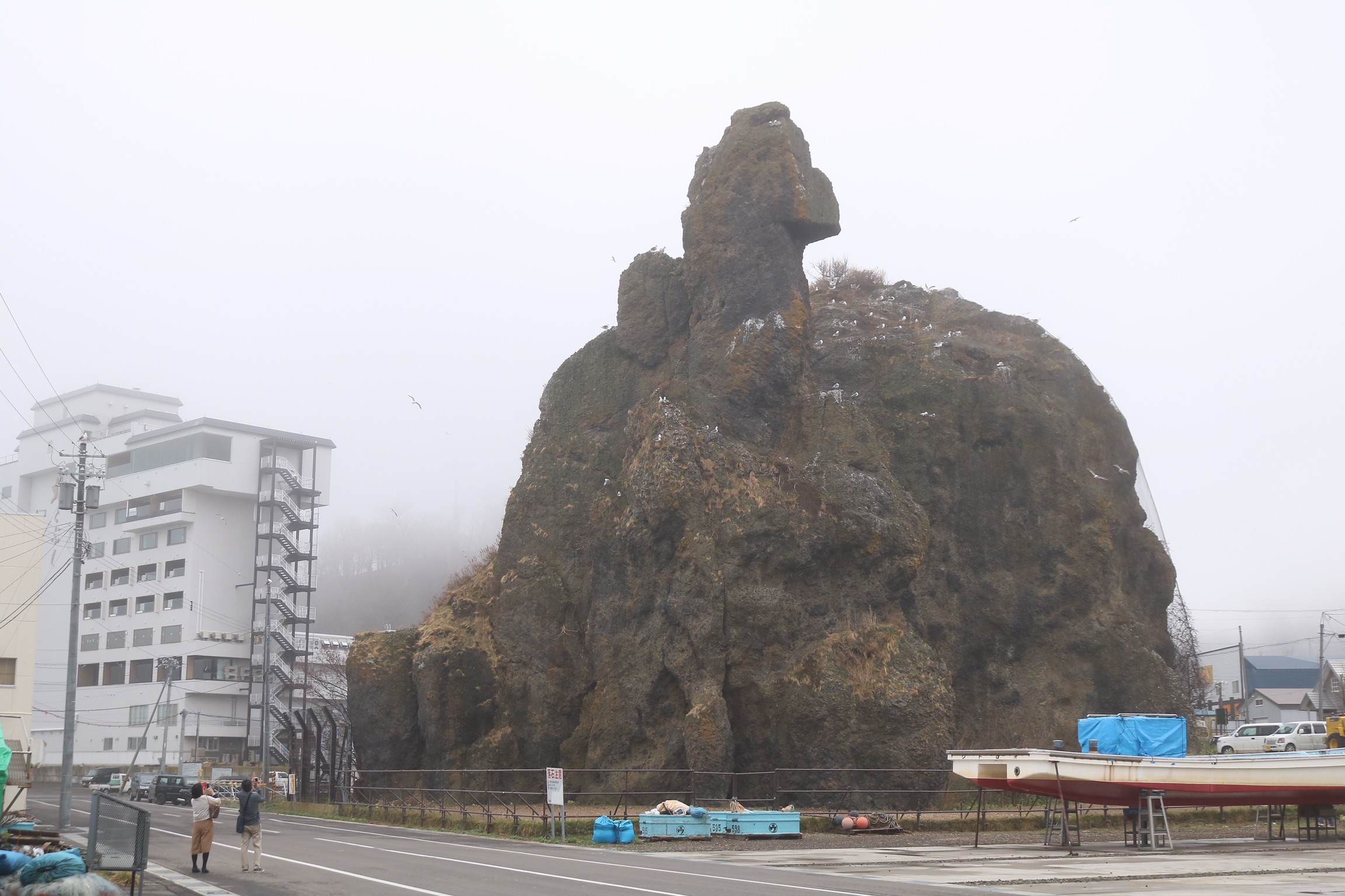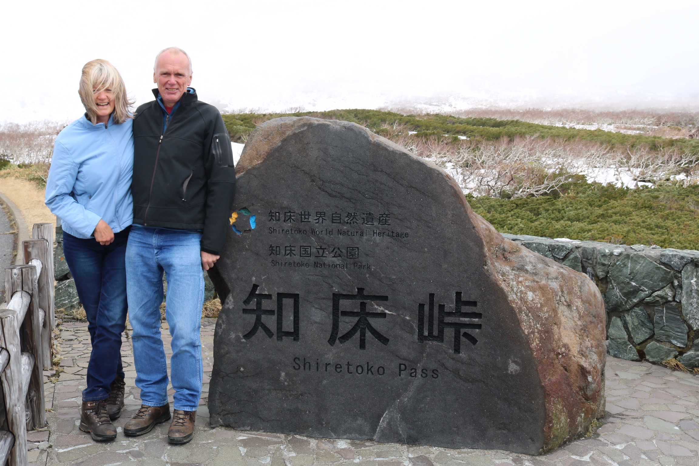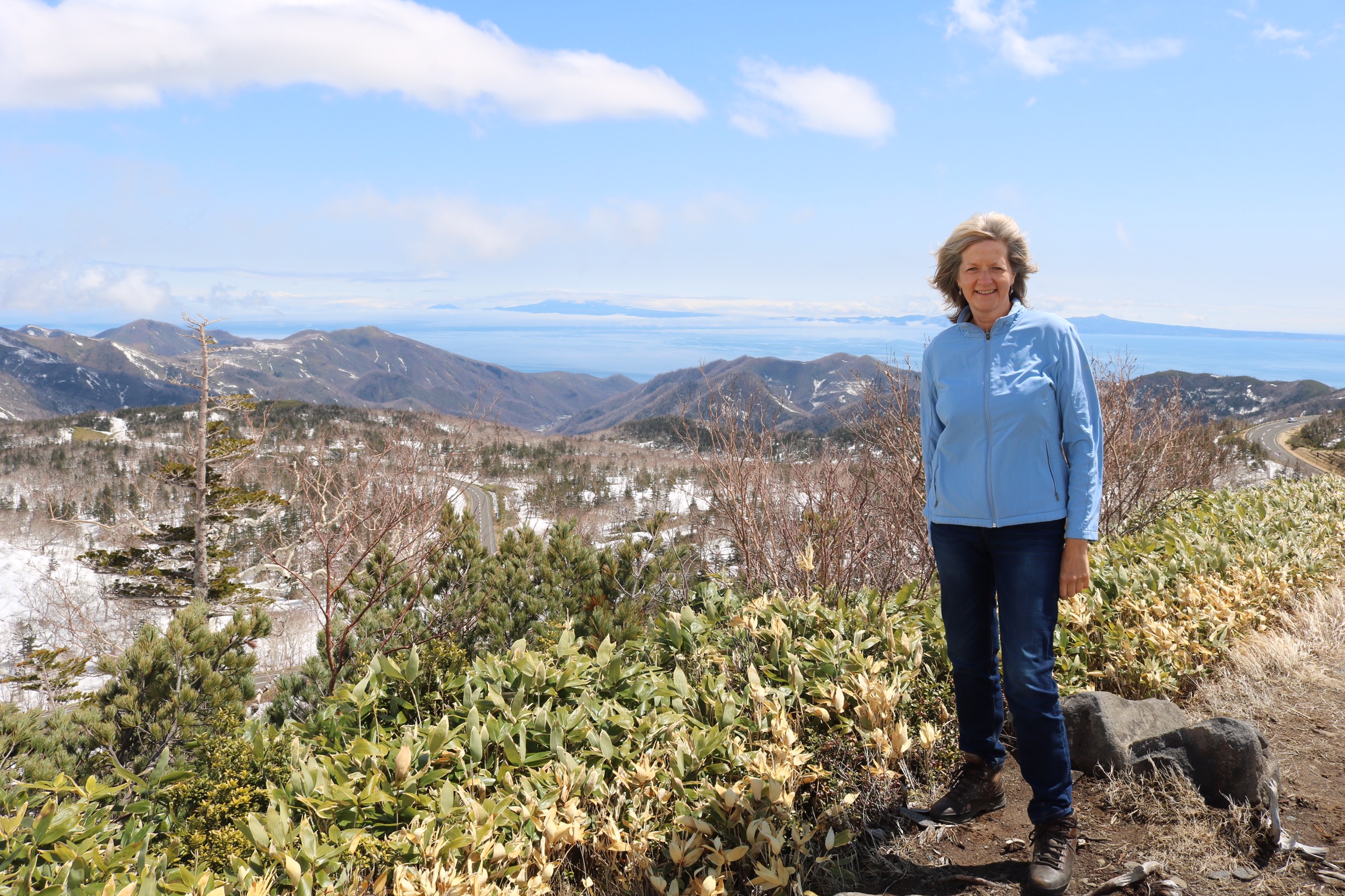 We had hoped to take a boat trip to try to see whales, but when we arrived in Utoro early in the morning, it was cold and grey. Visibility was very poor. So after a look at the fishing boats and the dinosaur rock, we decided to head to the Five Lakes to avoid the traffic jam that builds up waiting for the Shiretoko Pass to open at ten o’clock. But we encountered another traffic jam on the way to there, so we turned round and thankfully the jam at the pass entrance had cleared and the weather cleared as we reached the top, giving us lovely views to the Russian islands.
