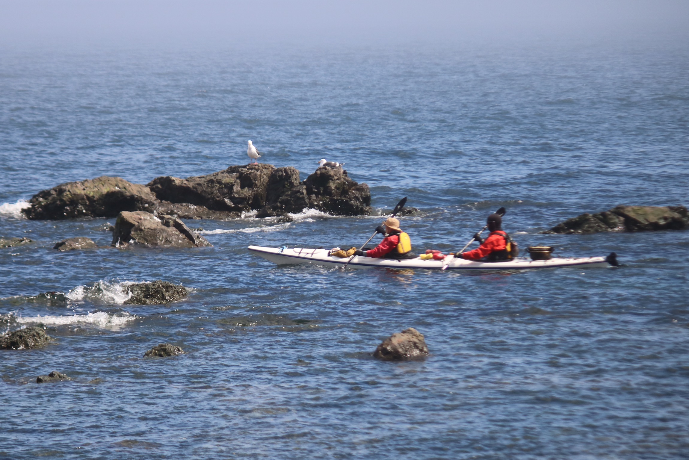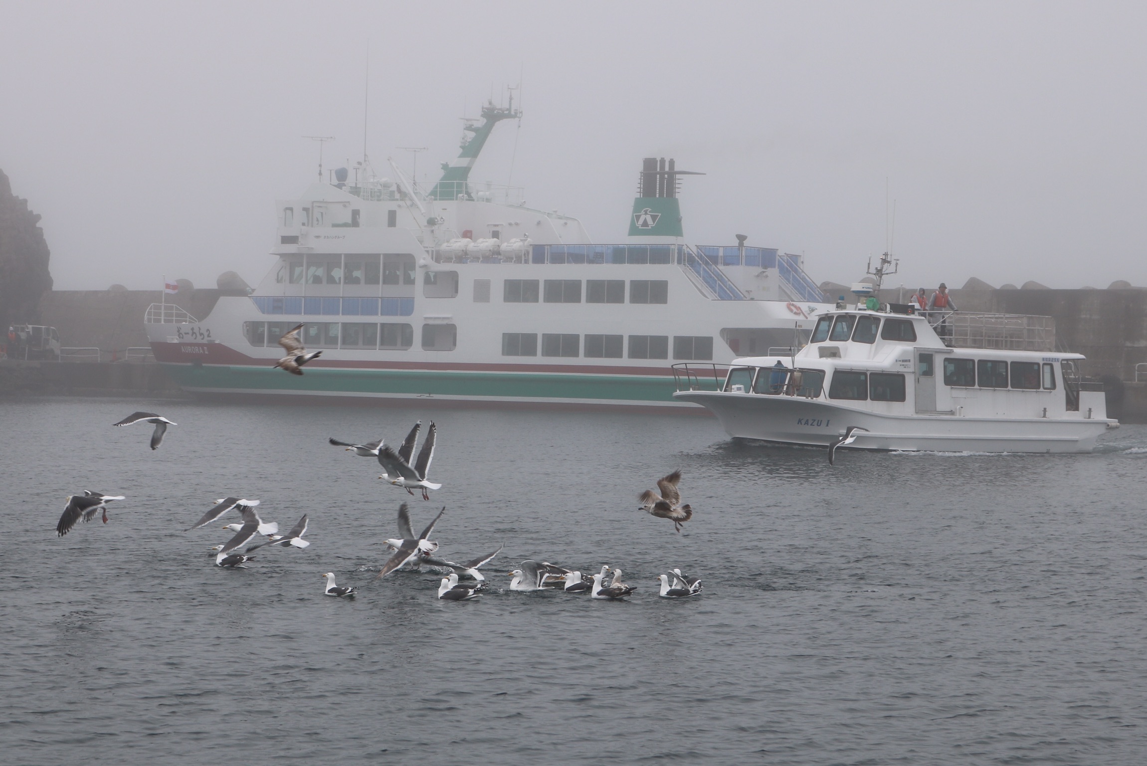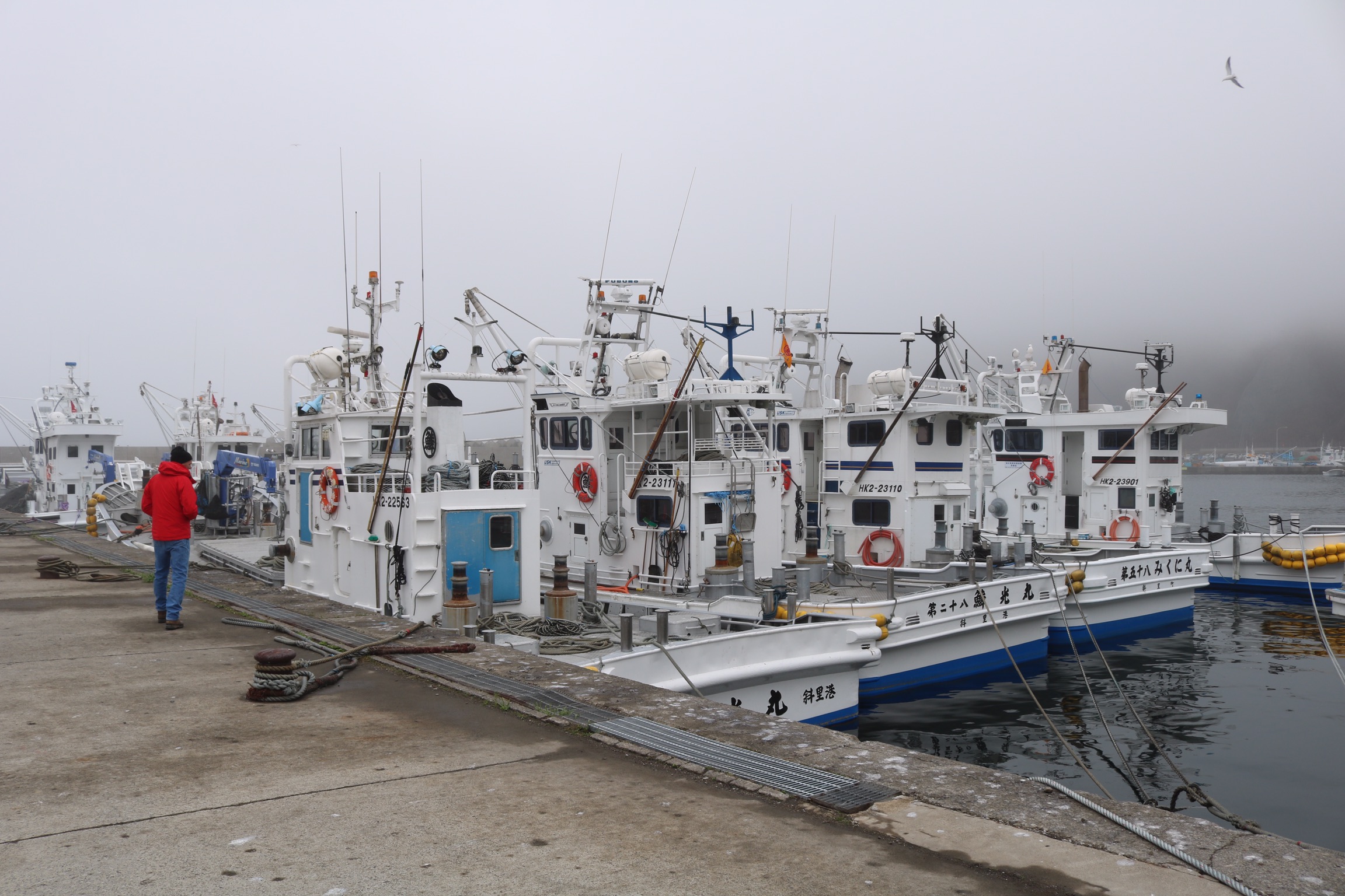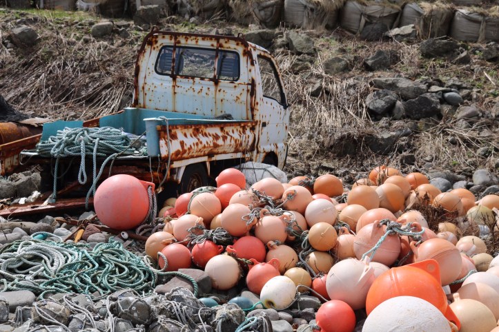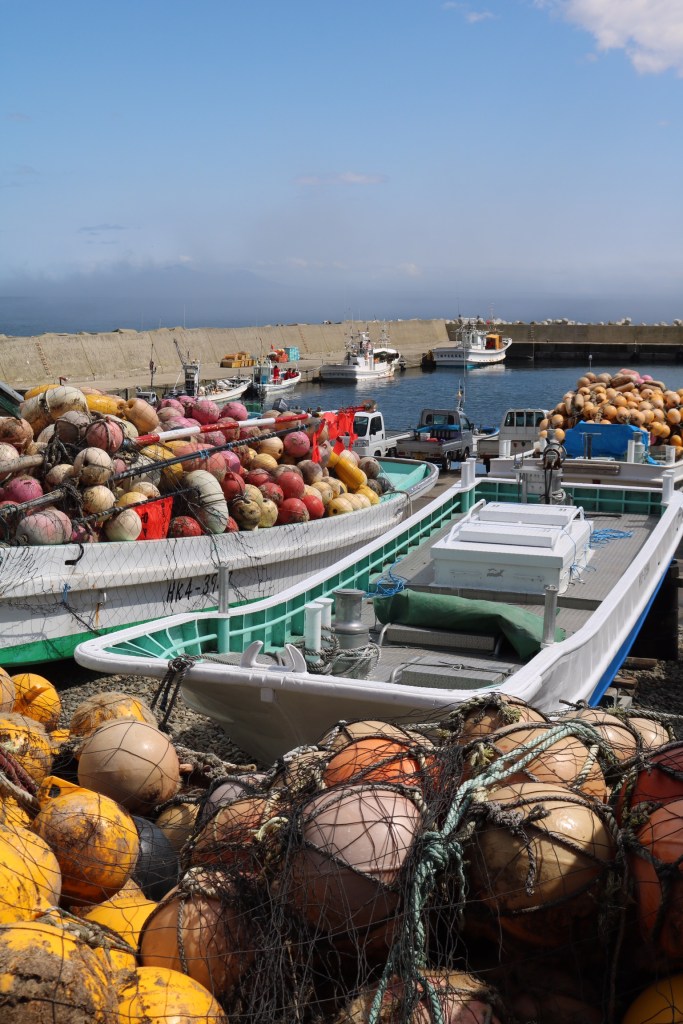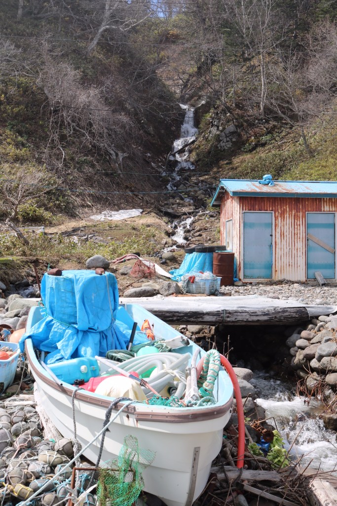 So we ended up at Rausu and drove to the end of the coast road, past a little beach hot spring and a great waterfall and went for a walk on the beach. It is a fishing community and they also harvest huge quantities of kelp and other seaweed which they dry. As it was early spring, none of the activity associated with the seaweed harvesting was happening, just lots of close drying sheds. The boats in the harbours too, were idle all gleaming from fresh paint, ready to take to sea. We watched some kayakers heading our into the mist where the warm air was meeting the cold air. Perhaps they would get to see wildlife? We saw man’s ability to mess up – vans left to rust and rot on the beach. Not what I had expected from a national park but I appreciate how hard life must be for the locals on an island that gets 6m of snow in winter and making a living from fishing or farming is difficult. Disposing of vehicles is not a top priority.