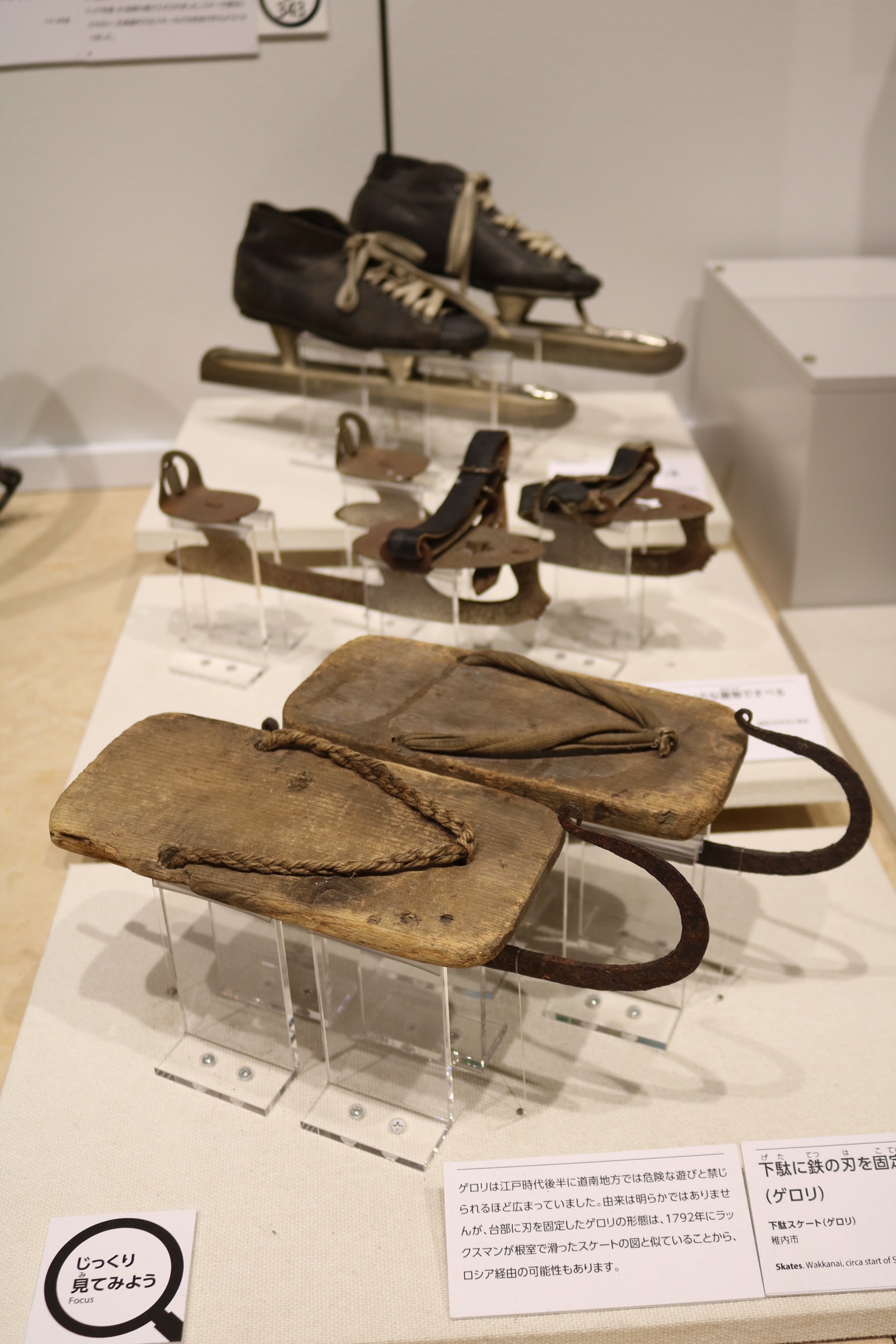 The museum is very modern and traces the history of the Ainu people who were the first dwellers in Hokkaido. Some of their culture is present still today and the videos of women playing their special musical instruments were interesting to see, especially the bone mouth card. It also has Jomon pottery from 1000 BC, so called due to the cord impressions in the clay, some great skeletons of mammoths and very early skates.